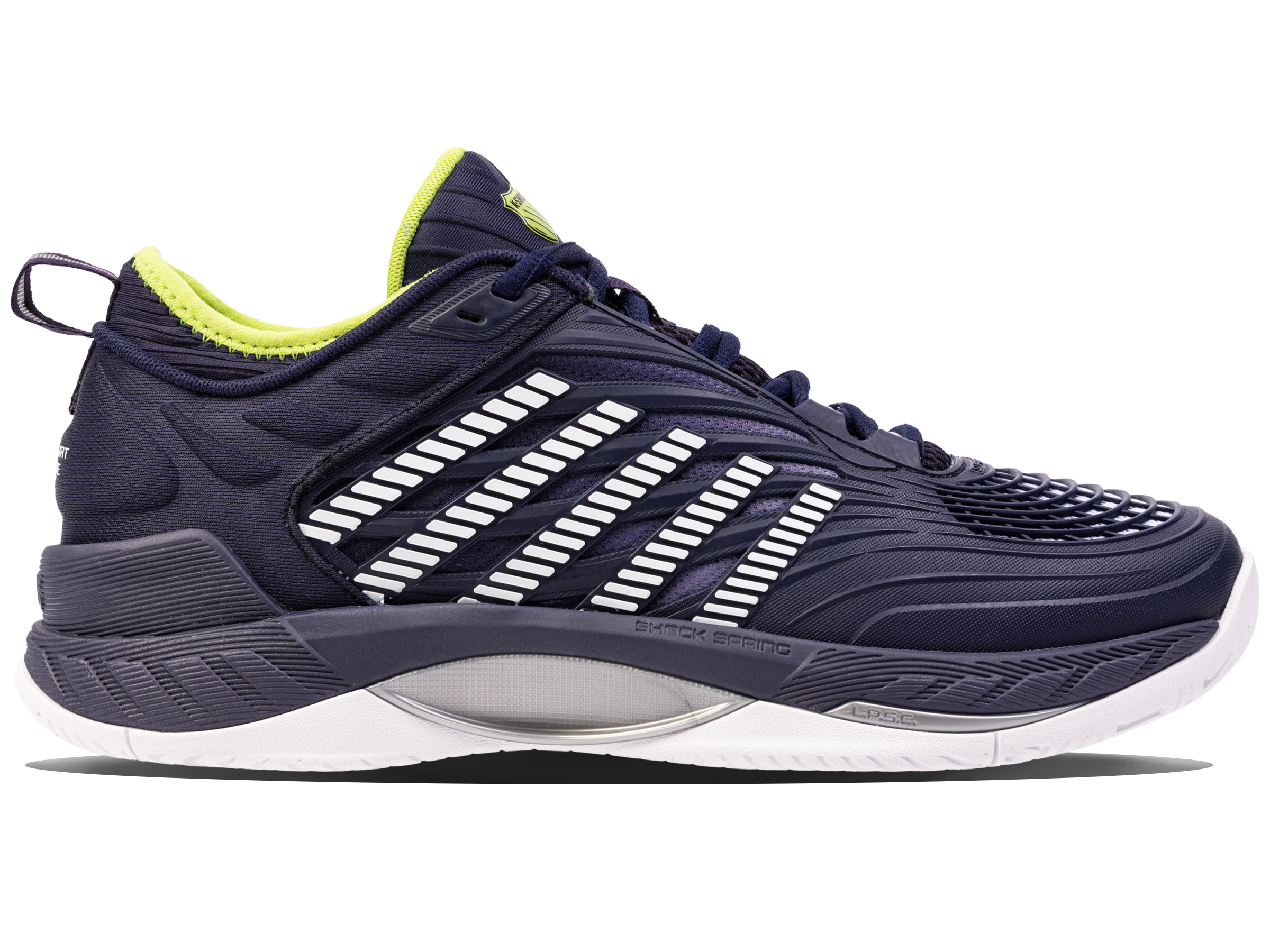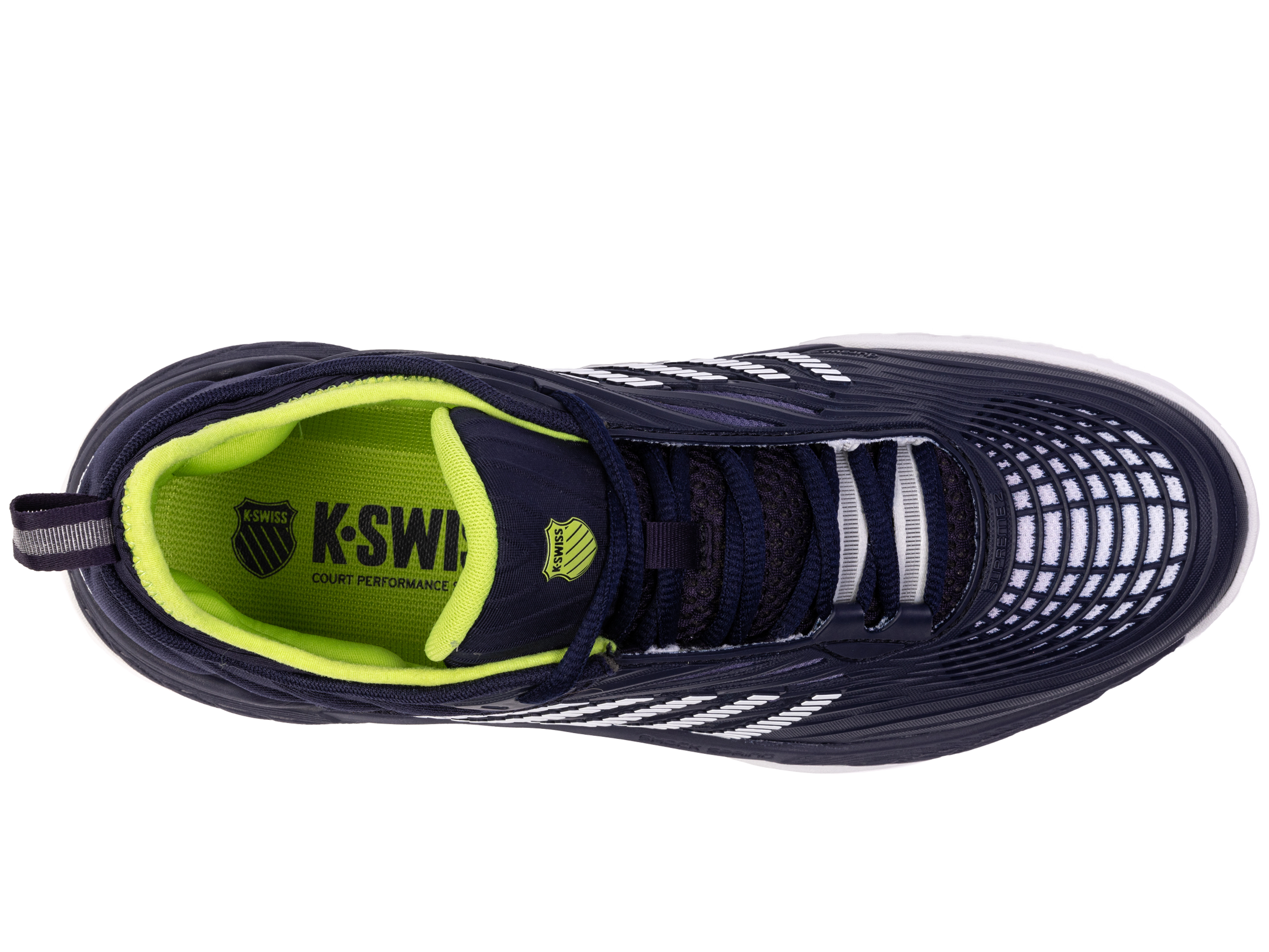 De K-Swiss Hypercourt Supreme 2 is het topmodel binnen de Hyper-familie. Dit jaar introduceren we een nieuwe versie met een betere pasvorm, extra ondersteuning en meer duurzaamheid en optimaal comfort. Het bovenwerk is gemaakt van Durawrap X voor uitstekende ondersteuning en bescherming tegen slijtage met behoud van flexibiliteit terwijl je je over de baan verplaatst. De tussenzool met dubbele dichtheid heeft een extern, lichtgewicht Surgelite-schuim voor maximaal comfort en ondersteuning. Het hoge rebound Shock Spring-binnenschuim op de voorvoet zorgt voor een snellere reactie bij elke stap. De Dragguard 7.0 rubberen buitenzool heeft een aangepast visgraatprofiel voor extra grip en duurzaamheid op alle soorten banen. De nieuw ontworpen, zachte kraag zorgt voor een betere pasvorm rond de enkel.