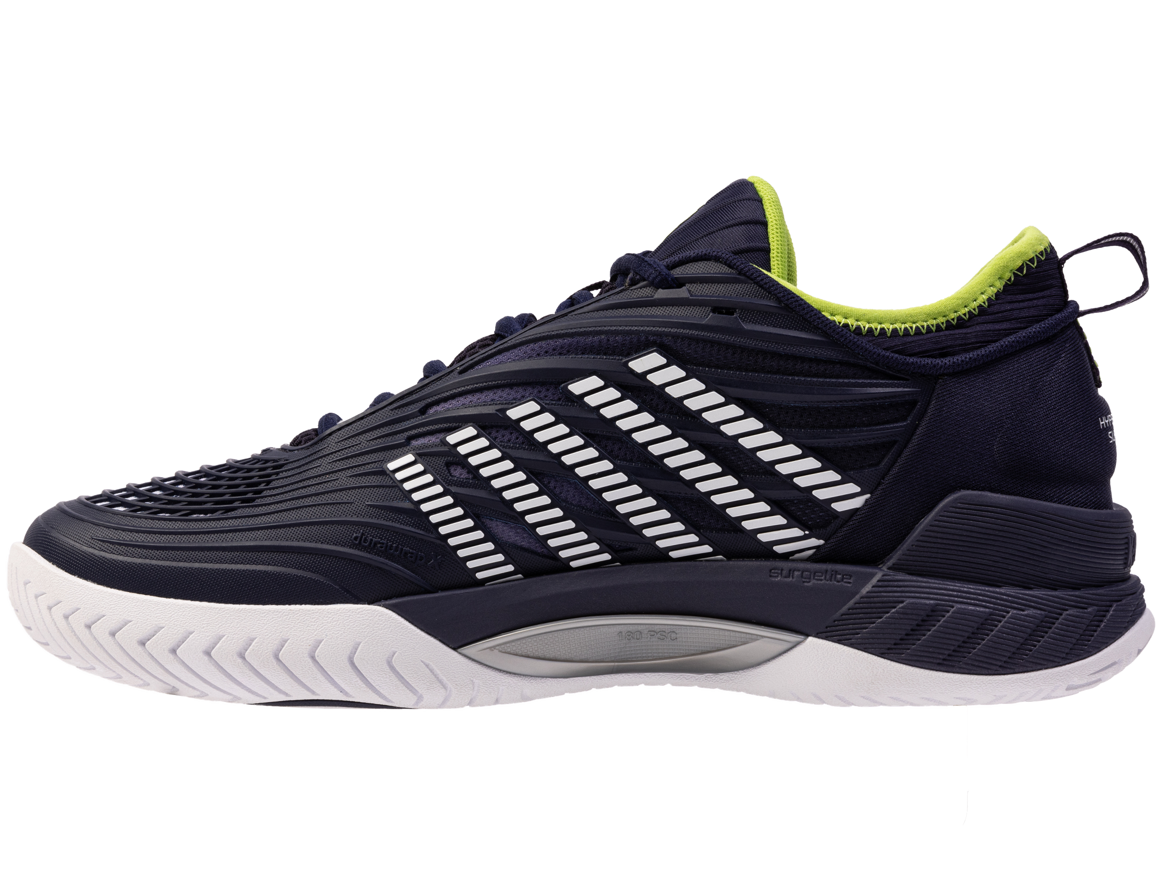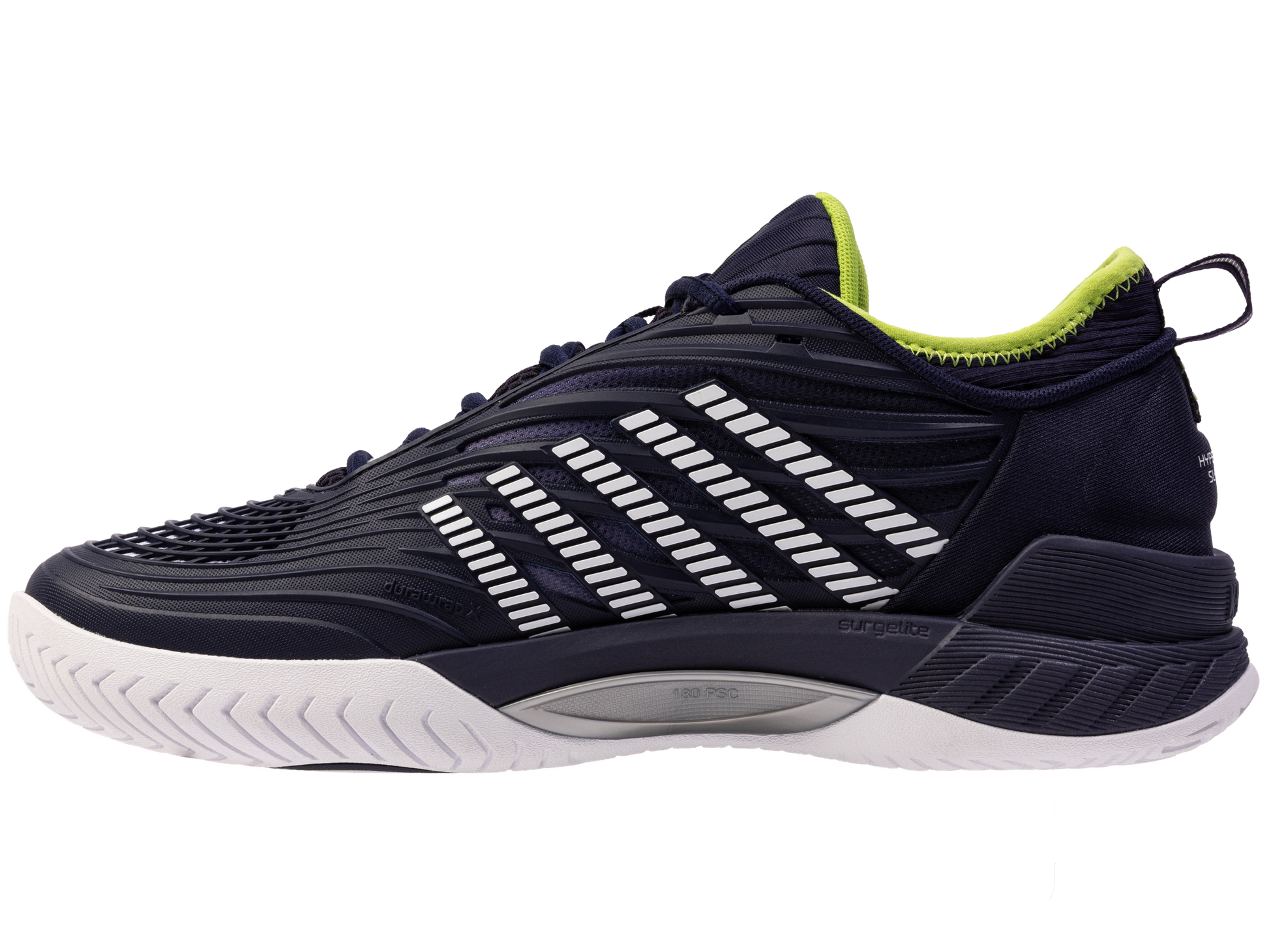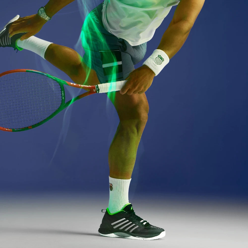 Der K-Swiss Hypercourt Supreme 2 ist das Spitzenmodell der Hyper-Serie. In diesem Jahr bringen wir eine aktualisierte Version auf den Markt, die eine noch sicherere Passform, noch besseren Halt und eine noch höhere Haltbarkeit bei gleichzeitig maximalem Komfort bietet. Das Obermaterial besteht aus Durawrap X, das für hervorragenden Halt und Schutz beim Rutschen sorgt und gleichzeitig ein flexibles Gefühl vermittelt, wenn Sie über den Platz sprinten. Die Dual-Density-Zwischensohle besteht für maximalen Komfort und Halt aus leichtem Surgelite-Außenschaum. Der reaktionsfreudige Shock-Spring-Innenschaum im Vorfußbereich ermöglicht noch schnellere Reaktionen bei jeder Aktion auf dem Platz. Die Dragguard-7.0-Gummilaufsohle verfügt über ein modifiziertes Fischgrätenprofil und sorgt für Traktion und Haltbarkeit auf allen Untergründen. Der neu entwickelte weiche Bootie-Kragen sorgt für einen sicheren Sitz um den Knöchel.